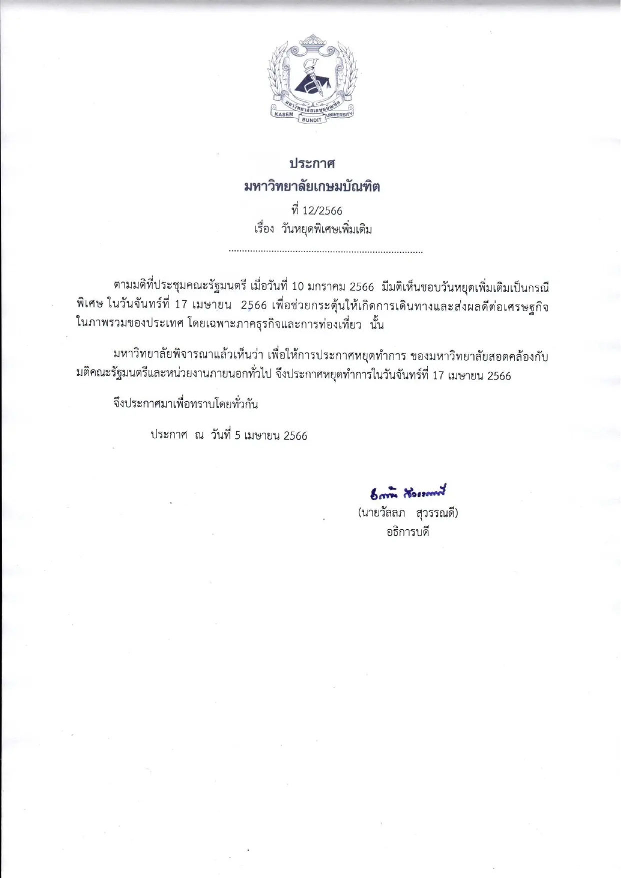ประกาศที่ 12/2566 เรื่อง วันหยุดพิเศษเพิ่มเติม