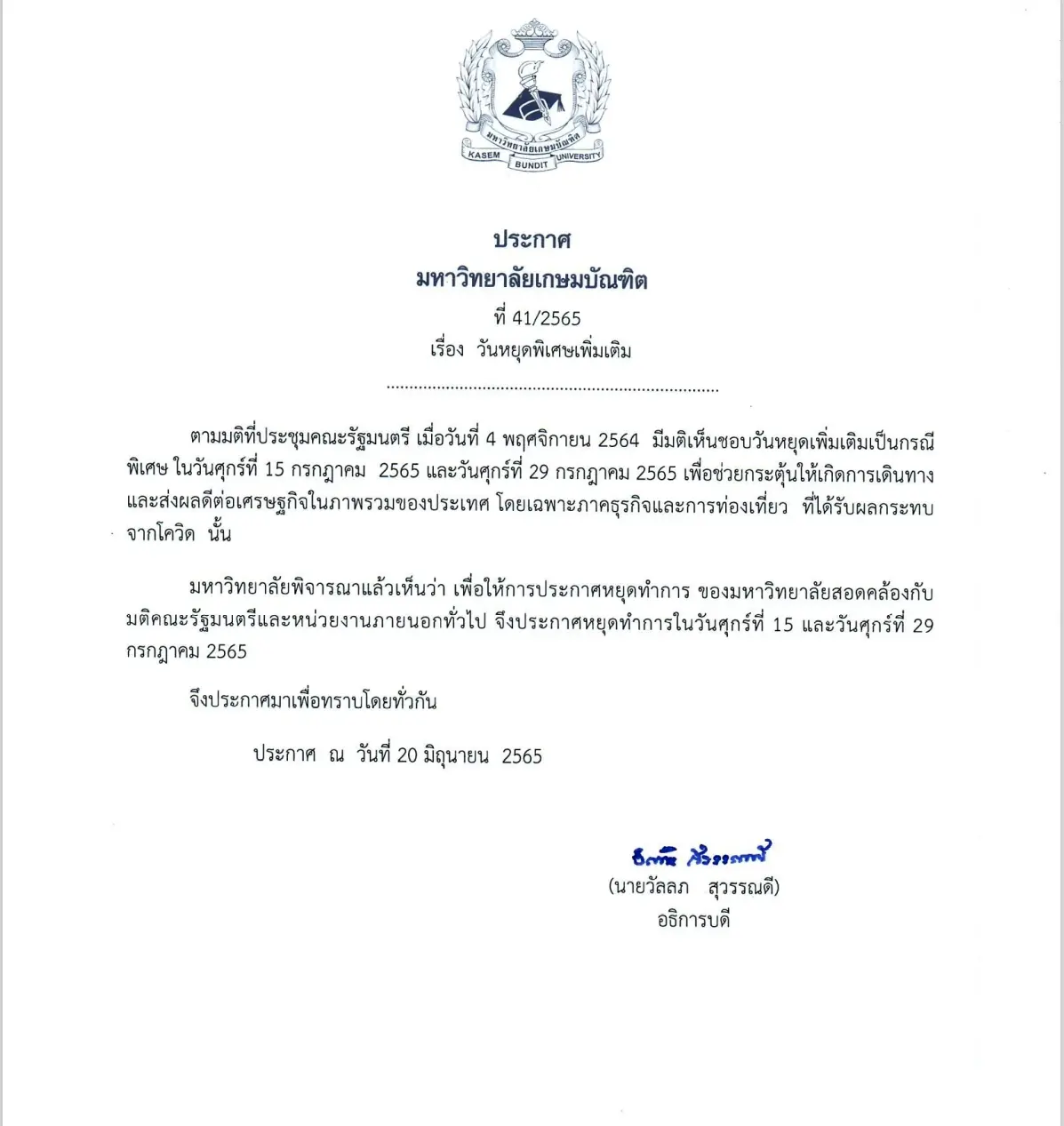 ประกาศ ที่ 41 – 2565 เรื่อง วันหยุดพิเศษเพิ่มเติม
