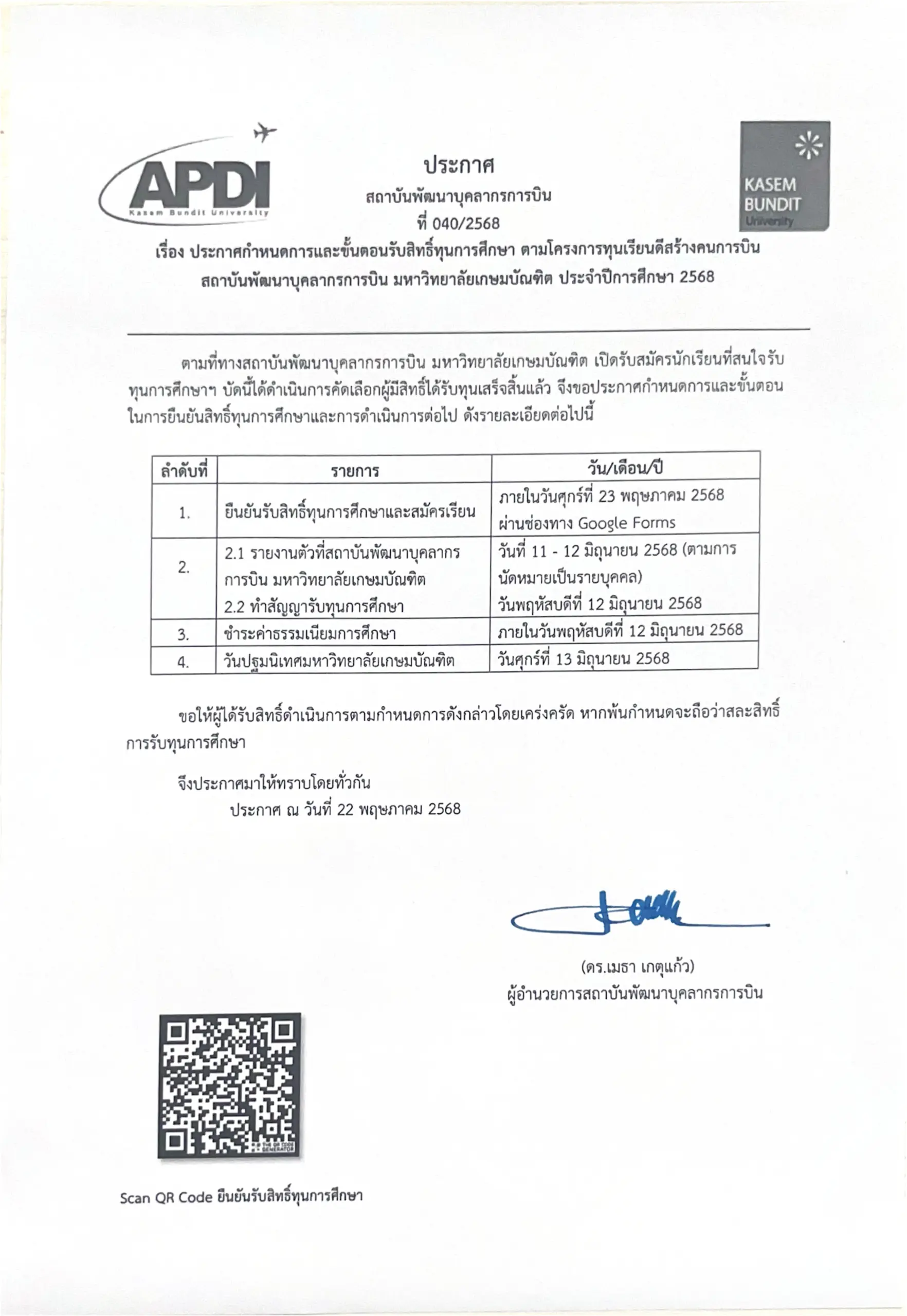 ประกาศกำหนดการและขั้นตอนรับสิทธิ์ทุนการศึกษา ตามโครงการทุนเรียนดีสร้างคนการบิน สถาบันพัฒนาบุตลากรการบิน มหาวิทยาลัยเกษมบัณฑิต ประจำปีการศึกษา 2568