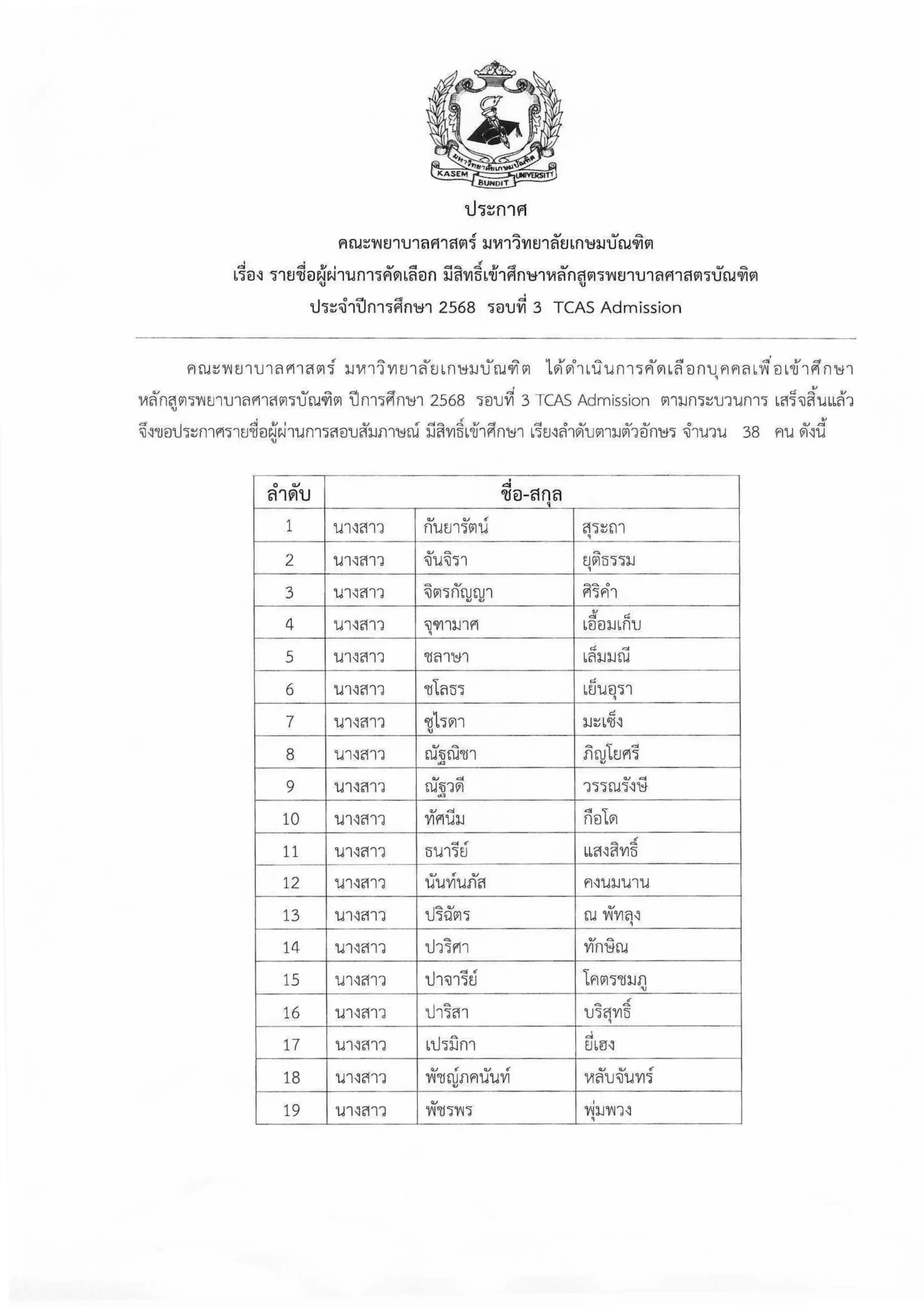 ประกาศรายชื่อผู้ผ่านการคัดเลือกมีสิทธิ์เข้าศึกษาหลักสูตรพยาบาลศาสตรบัณฑิต ประจำปีการศึกษา 2568 รอบที่ 3 TCAS Admission จำนวน 38 คน