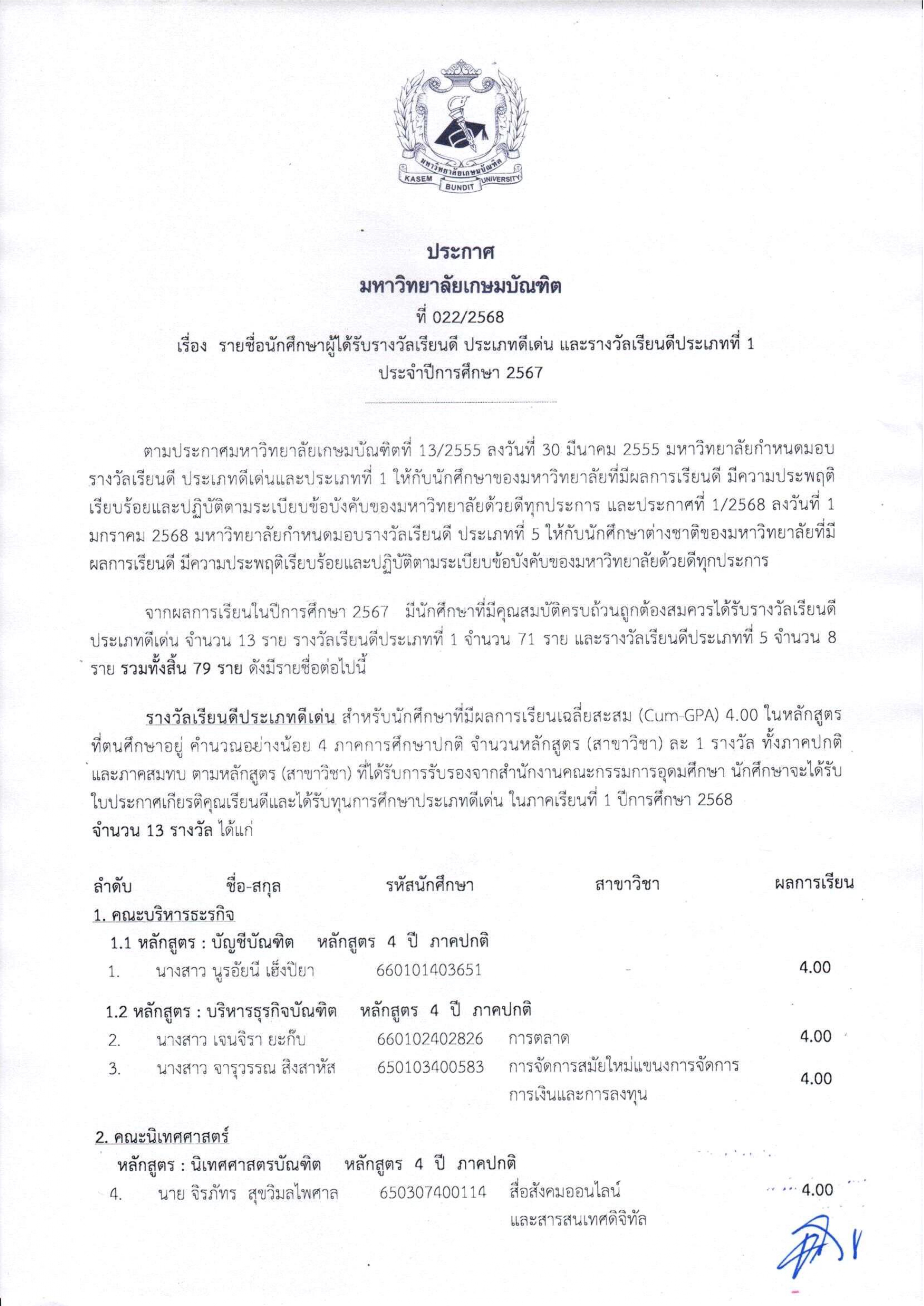 ประกาศที่ 22/2568 รายชื่อนักศึกษาผู้ได้รับรางวัลเรียนดี ประเภทดีเด่น และรางวัลเรียนดีประเภท 1 ประจำปีการศึกษา 2567