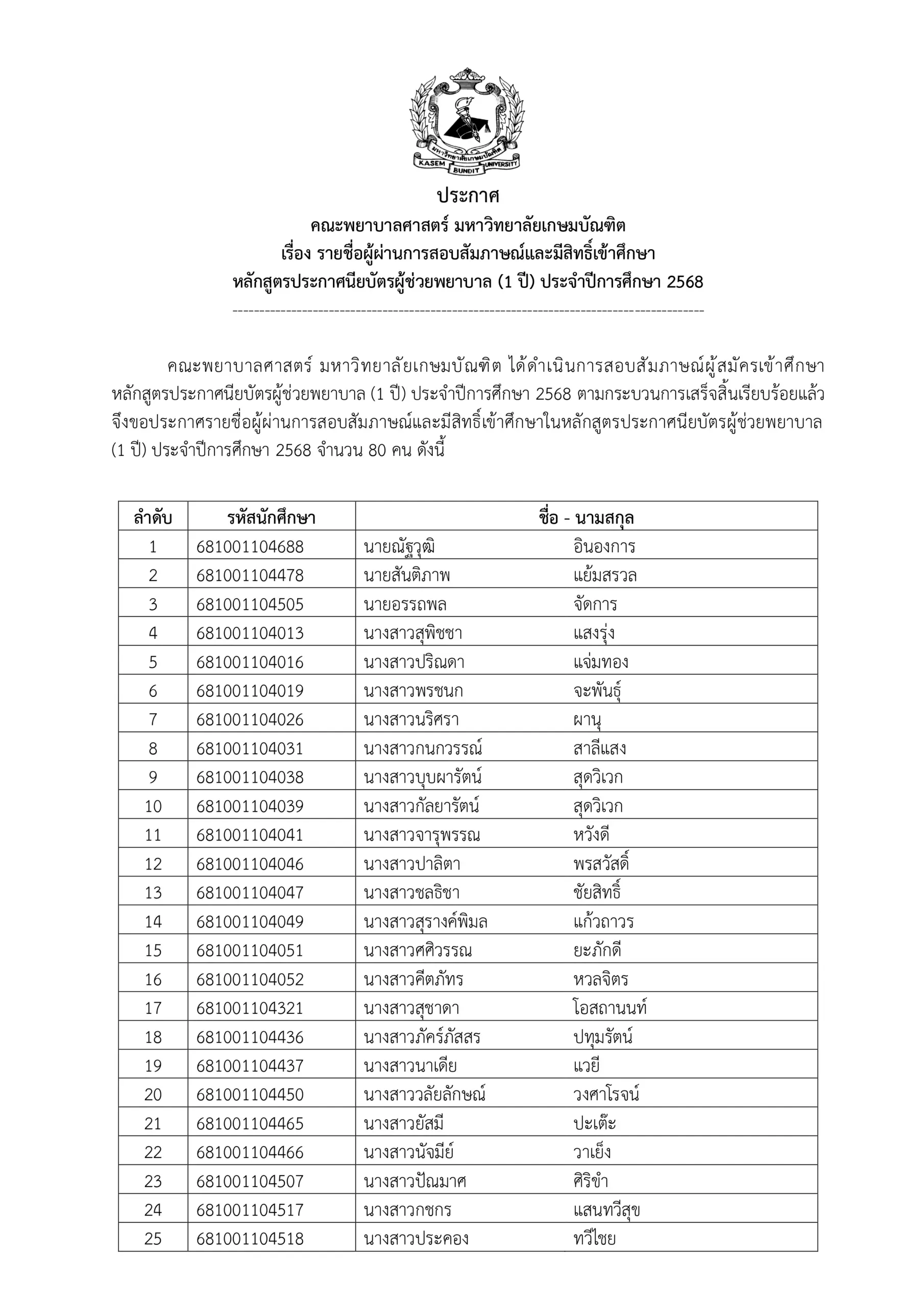 ประกาศราย ชื่อผู้ผ่านการสอบสัมภาษณ์และมีสิทธิ์เข้าศึกษาหลักสูตรประกาศนียบัตรผู้ช่วยพยาบาล (1 ปี) ประจำปีการศึกษา 2568
