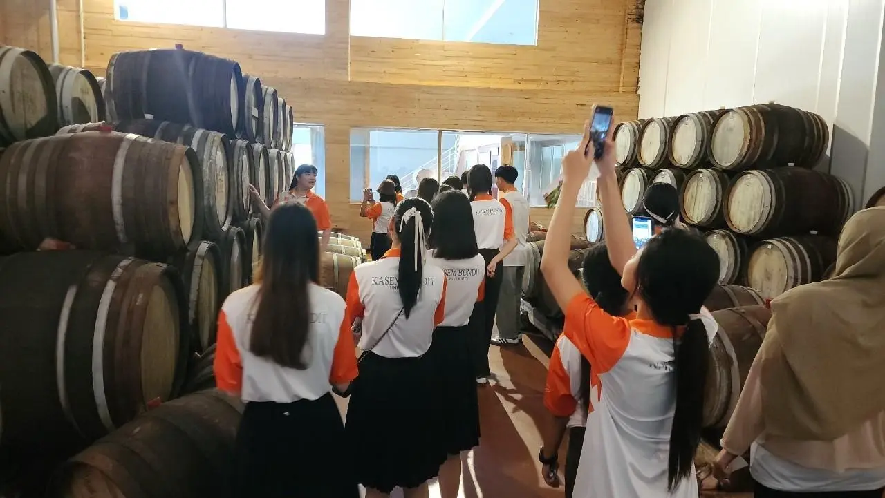 ต่อด้วยการเยี่ยมชม PB Valley Khao Yai Winery ที่นี่นักศึกษาได้ดื่มด่ำกับความรู้เกี่ยวกับการผลิตไวน์ชั้นเลิศ พร้อมเรียนรู้ศิลปะการเลือกและเสิร์ฟไวน์ให้เข้ากับอาหารบนเครื่องบิน ทักษะสำคัญสำหรับการบริการในชั้นธุรกิจและเฟิร์สคลาส