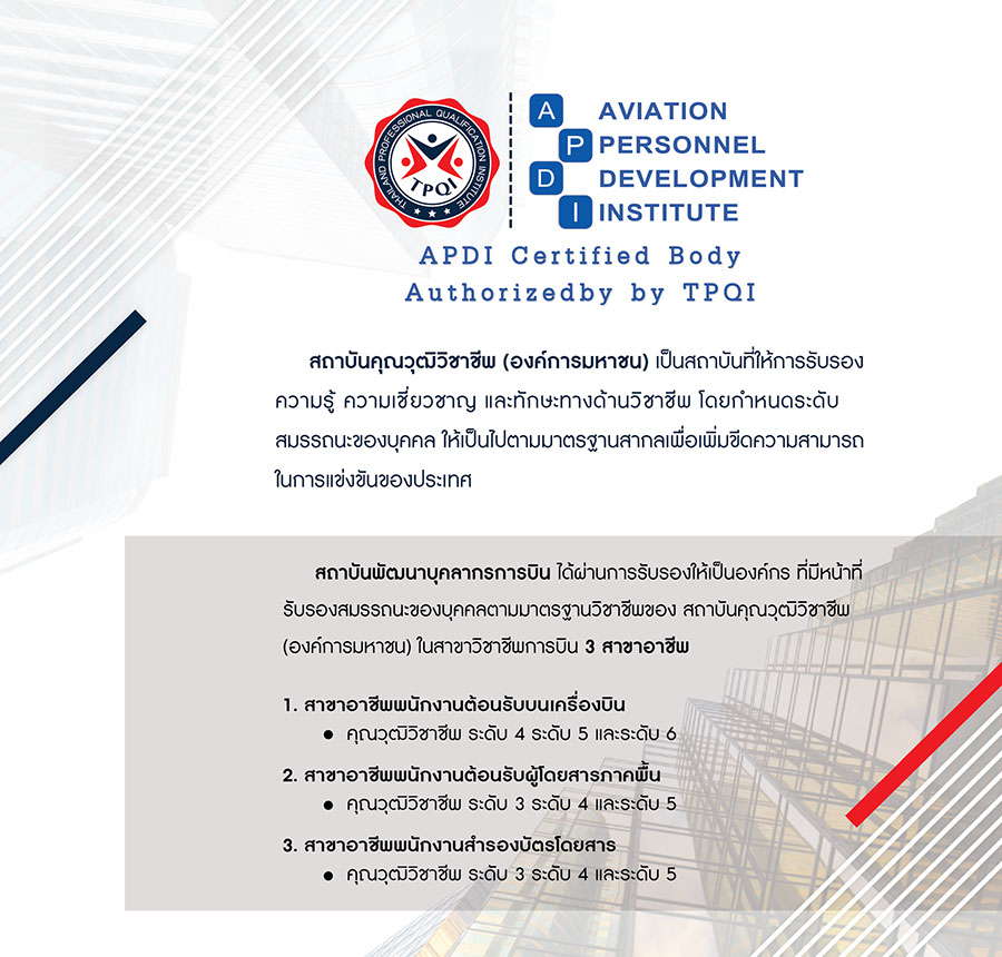 – มาตรฐานอาชีพและคุณวุฒิวิชาชีพ สาขาบริการภาคพื้น และสนับสนุนการบินภาคพื้นในอาคาร