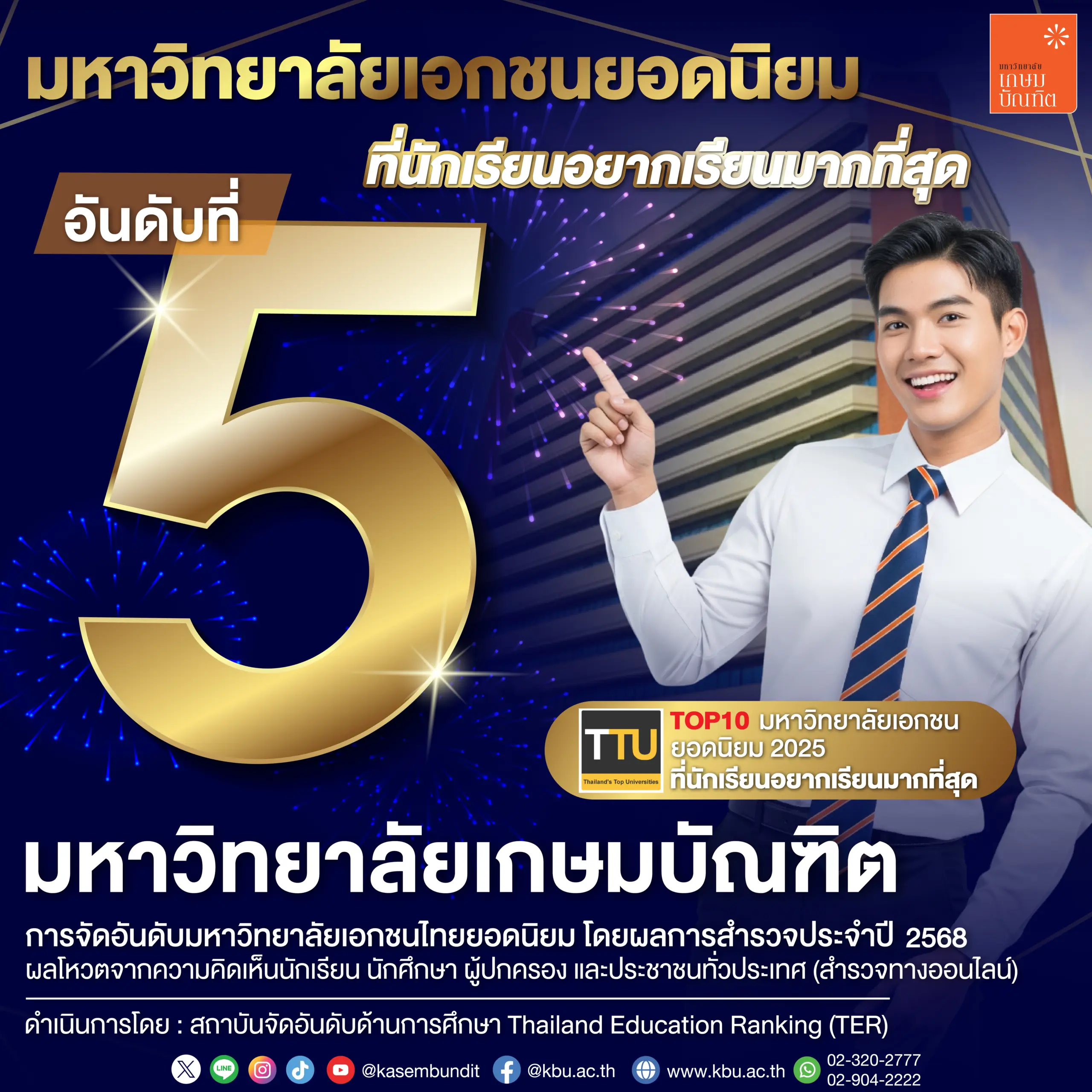 ม.เกษมบัณฑิต คว้าอันดับ 5 มหาวิทยาลัยเอกชนยอดนิยม ปี 2568 ตอกย้ำความเชื่อมั่นจากนักเรียนทั่วประเทศ