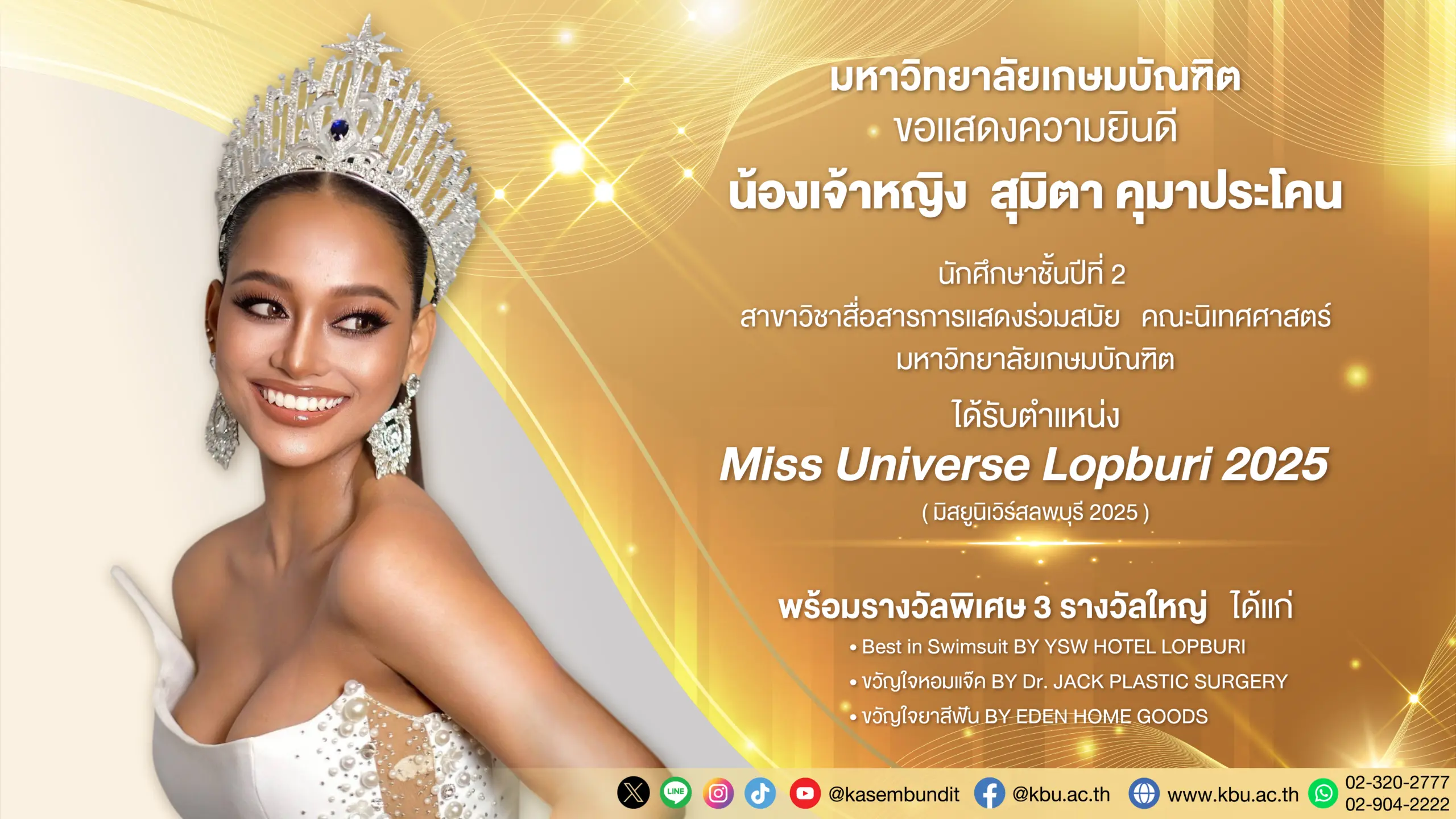 มหาวิทยาลัยเกษมบัณฑิต ขอแสดงความยินดีกับ นางสาวสุมิตา คุมาประโคน (น้องเจ้าหญิง) นักศึกษาชั้นปีที่ 2 สาขาวิชาสื่อสารการแสดงร่วมสมัย คณะนิเทศศาสตร์ สร้างชื่อเสียงให้กับมหาวิทยาลัย ได้รับเลือกใน ตำแหน่ง มิสยูนิเวิร์สลพบุรี 2025 บนเวทีการประกวดที่เต็มไปด้วยผู้เข้าร่วมที่มีความสามารถและศักยภาพจากทั่วจังหวัดลพบุรี