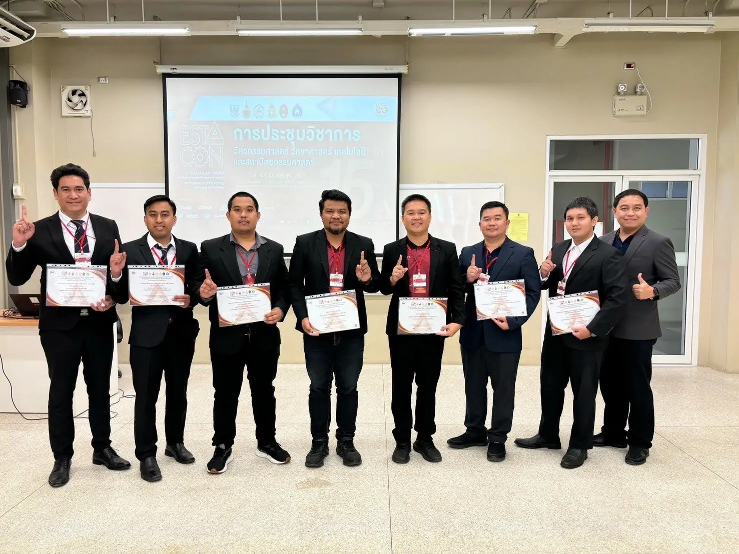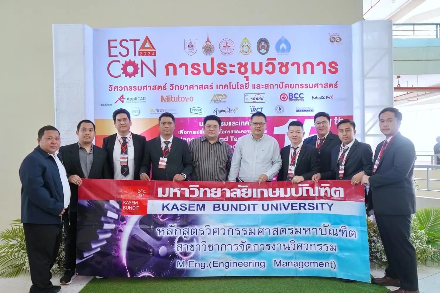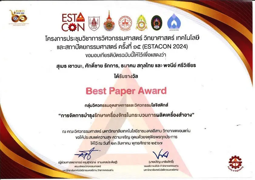 นักศึกษาหลักสูตรวิศวกรรมศาสตรมหาบัณฑิต สาขาวิชาการจัดการงานวิศวกรรม รับรางวัลบทความวิจัยดีเด่น (Best paper Award) เรื่อง “การจัดการบำรุงรักษาเครื่องจักรในกระบวนการผลิตเครื่องสำอาง” ซึ่งเป็นผลงานของนายสุเมธ เชาวนะ ในการประชุมวิชาการวิศวกรรมศาสตร์ วิทยาศาสตร์ เทคโนโลยี และสถาปัตยกรรมศาสตร์ ครั้งที่ 15 (ESTACON) นวัตกรรมและเทคโนโลยีเพื่อการเปลี่ยนแปลงโอกาสและความท้าทาย จัดขึ้น ณ มหาวิทยาลัยเทคโนโลยีเทคโนโลยีราชมงคลอีสาน วิทยาเขตขอนแก่น จังหวัดขอนแก่น ในงานดังกล่าวหลักสูตรฯ สนับสนุนให้ นักศึกษาเข้าร่วมนำเสนอผลงานวิจัยจำนวน 9 ผลงาน ในจำนวนนี้มี 1 ผลงานจากนายสุเมธ เชาวนะ ที่ได้รับรางวัลอันทรงคุณค่านี้ จากผู้เข้าร่วมนำเสนอบทความทั้งสิ้นมากกว่า 200 บทความวิจัย จัดขึ้นเมื่อวันศุกร์ที่ 23 สิงหาคม 2567 ณ อาคาร 50 ปี เทคนิคไทย-เยอรมัน ขอนแก่น