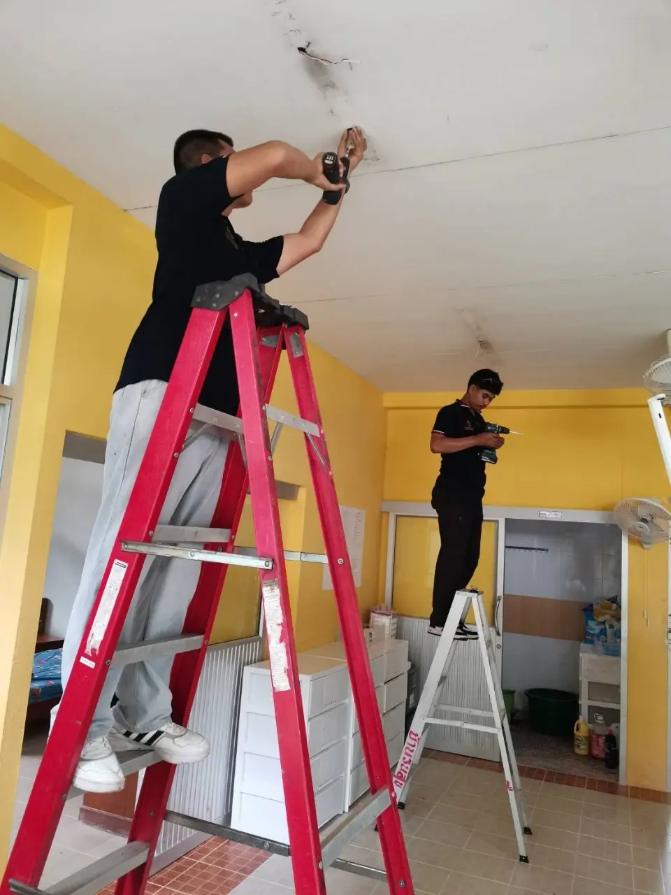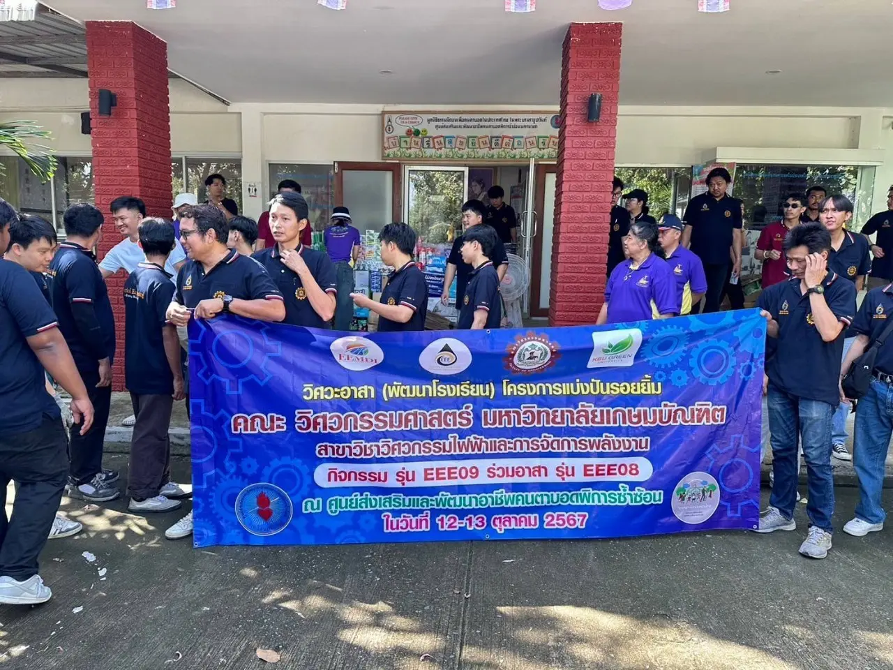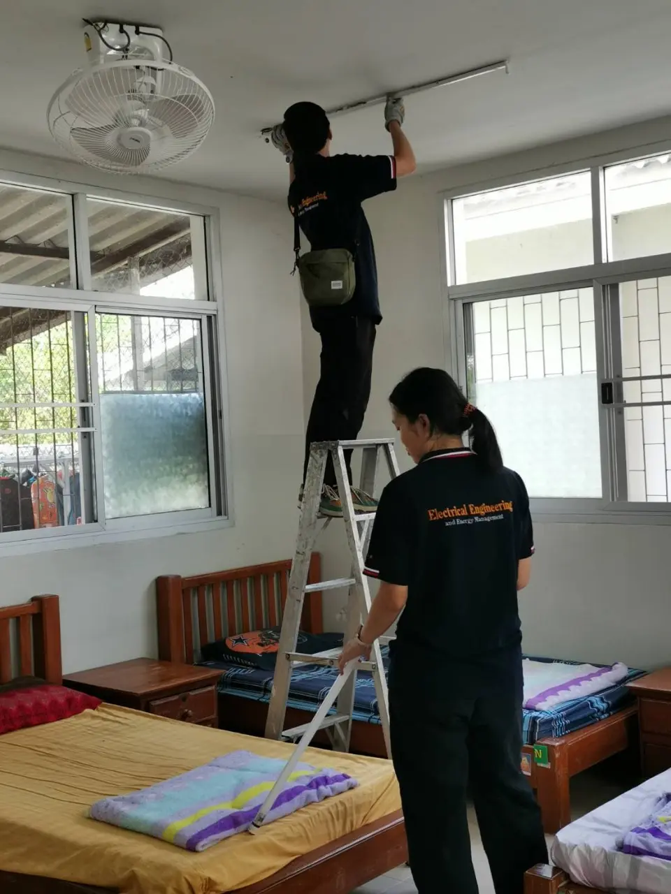 นักศึกษาจาก สาขาวิชาวิศวกรรมไฟฟ้าและการจัดการพลังงาน คณะวิศวกรรมศาสตร์ รุ่น EEE08 และ รุ่น EEE09 จัดโครงการ “วิศวะอาสาพัฒนา Green Technology” โดยยกทีมเข้าช่วยซ่อมอุปกรณ์ เครื่องใช้ไฟฟ้า และแสงสว่างที่ชำรุด และติดตั้งระบบแสงสว่าง แบบประหยัดพลังงานเพิ่มให้กับ ศูนย์ส่งเสริมและพัฒนาอาชีพคนตาบอดพิการช้ำซ้อนครนายก บ้านเรื่นสุข จังหวัดนครนายก เพื่อพัฒนา Green Technology เพื่อคนพิการ ให้มีโอกาสอยู่ในสังคม เป็นจิตอาสาที่เพื่อนมนุษย์ควรหยิบยื่นให้กัน พร้อมเลี้ยงอาหารกลางวันให้กับสมาชิกในศูนย์ฯ