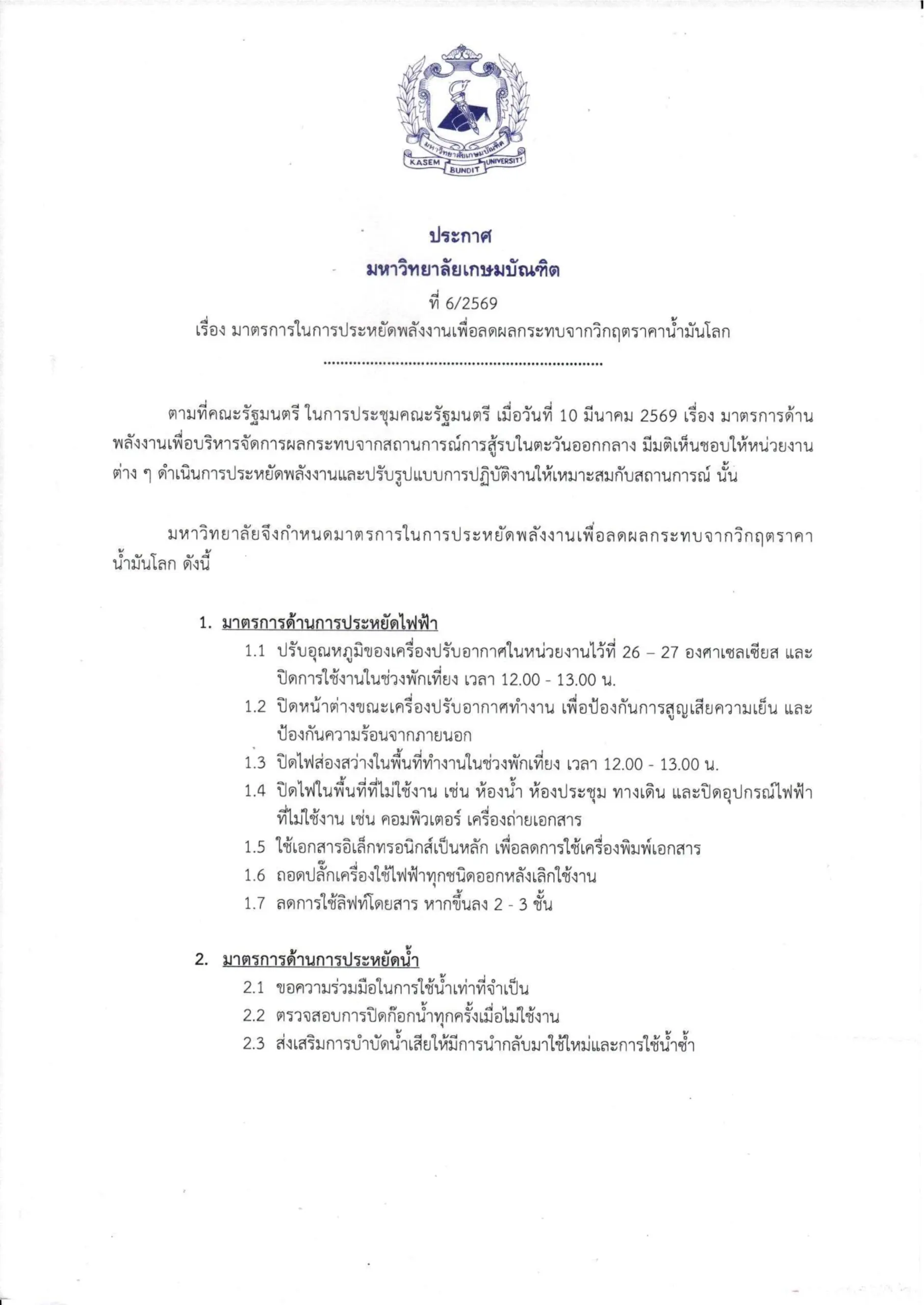 ประกาศที่ 6/2569 มาตรการในการประหยัดพลังงานเพื่อลดผลกระทบจากวิกฤตราคาน้ำมันโลก
