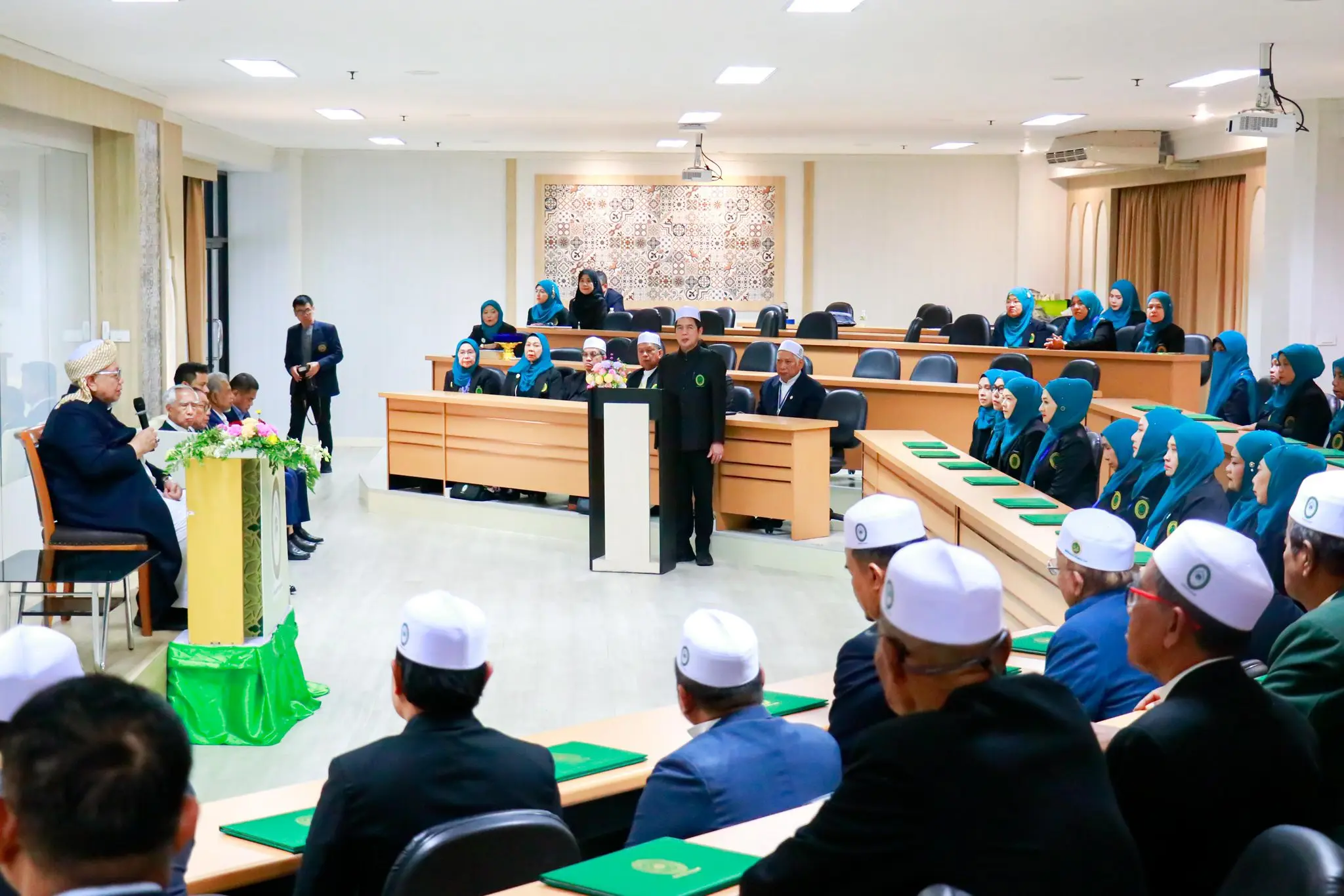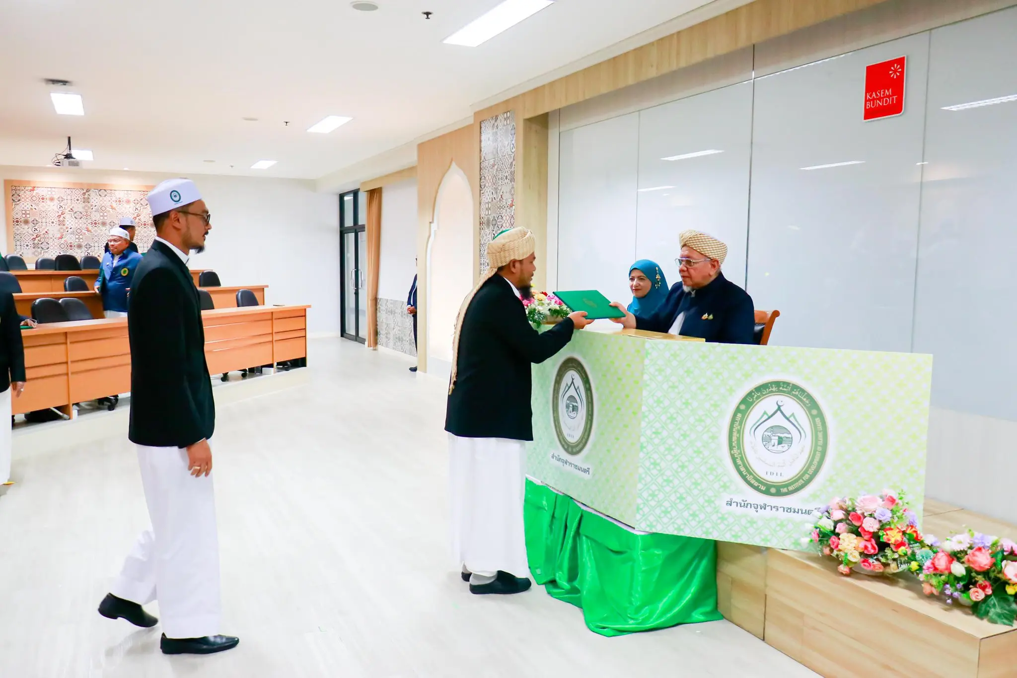 ดร.วัลลภ สุวรรณดี อธิการบดี พร้อมด้วย ดร.ศรัณย์ สายฟ้า ผู้ช่วยอธิการบดีฝ่ายบริหาร มหาวิทยาลัยเกษมบัณฑิต ให้การต้อนรับ นายอรุณ บุญชม จุฬาราชมนตรี ในโอกาสให้เกียรติบรรยายพิเศษและมอบประกาศนียบัตรแก่ผู้เข้าอบรมในหลักสูตร “การพัฒนาภาวะความเป็นผู้นำศาสนายุคใหม่” หลักสูตรที่ 2 รุ่นที่ 8 และ “การพัฒนาภาวะความเป็นผู้นำมุสลิมะห์ยุคใหม่” หลักสูตรที่ 2 รุ่นที่ 5 บรรยากาศภายในงานเต็มไปด้วยความอบอุ่นและเปี่ยมด้วยสาระ โดยมหาวิทยาลัยมุ่งส่งเสริมการเรียนรู้และพัฒนาผู้นำศาสนาในสังคมยุคใหม่อย่างต่อเนื่อง