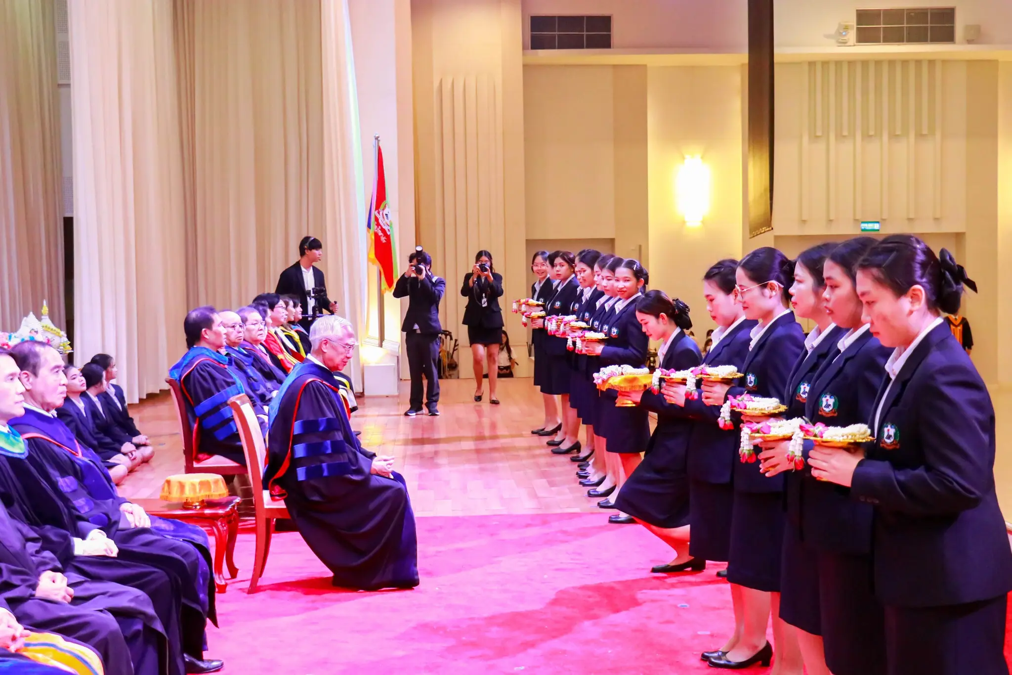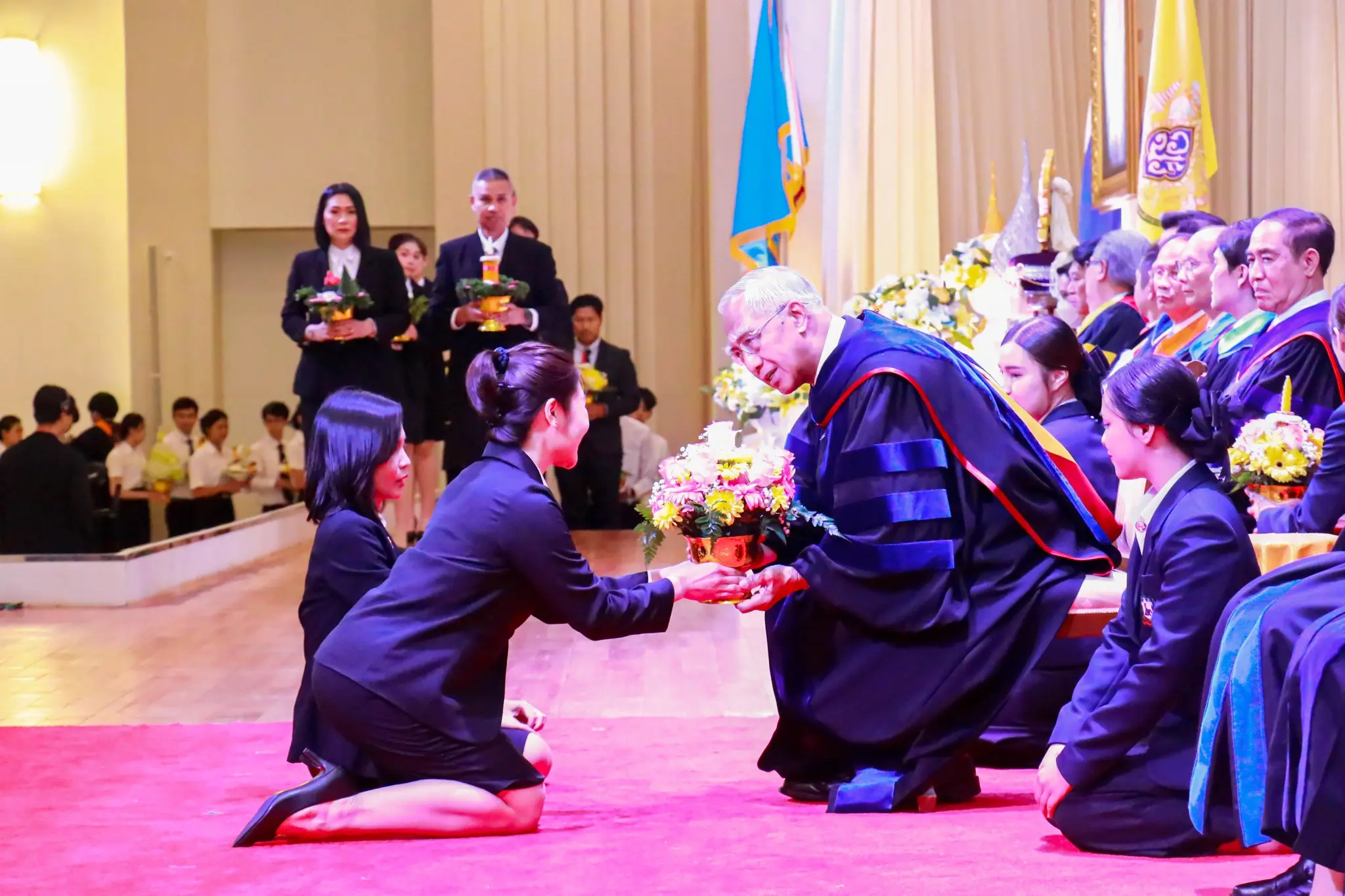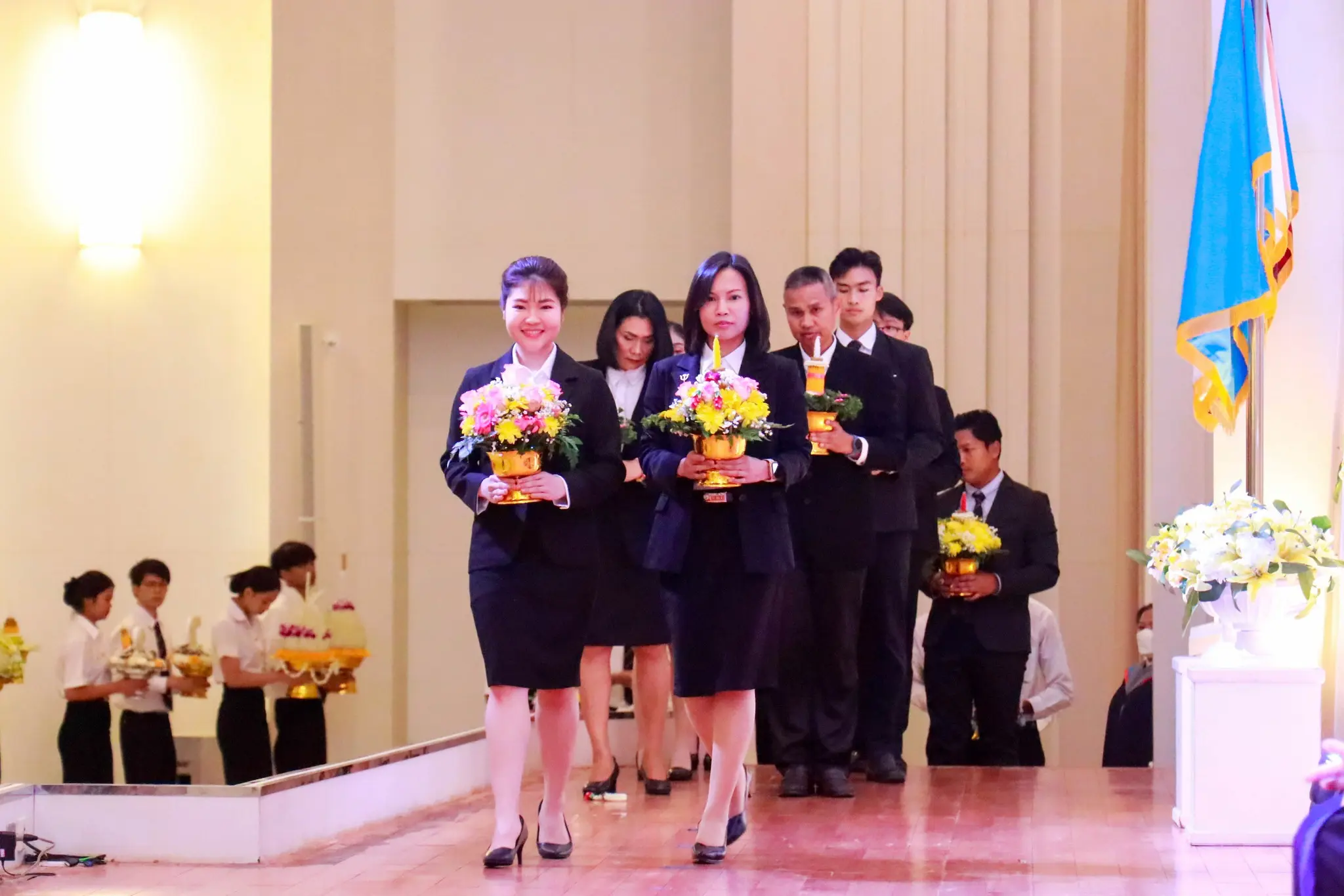 มีผู้แทนนักศึกษาใหม่ จากทุกคณะ ร่วมกันจัดพานดอกไม้ เข้าร่วมพิธีอย่างสวยงาม