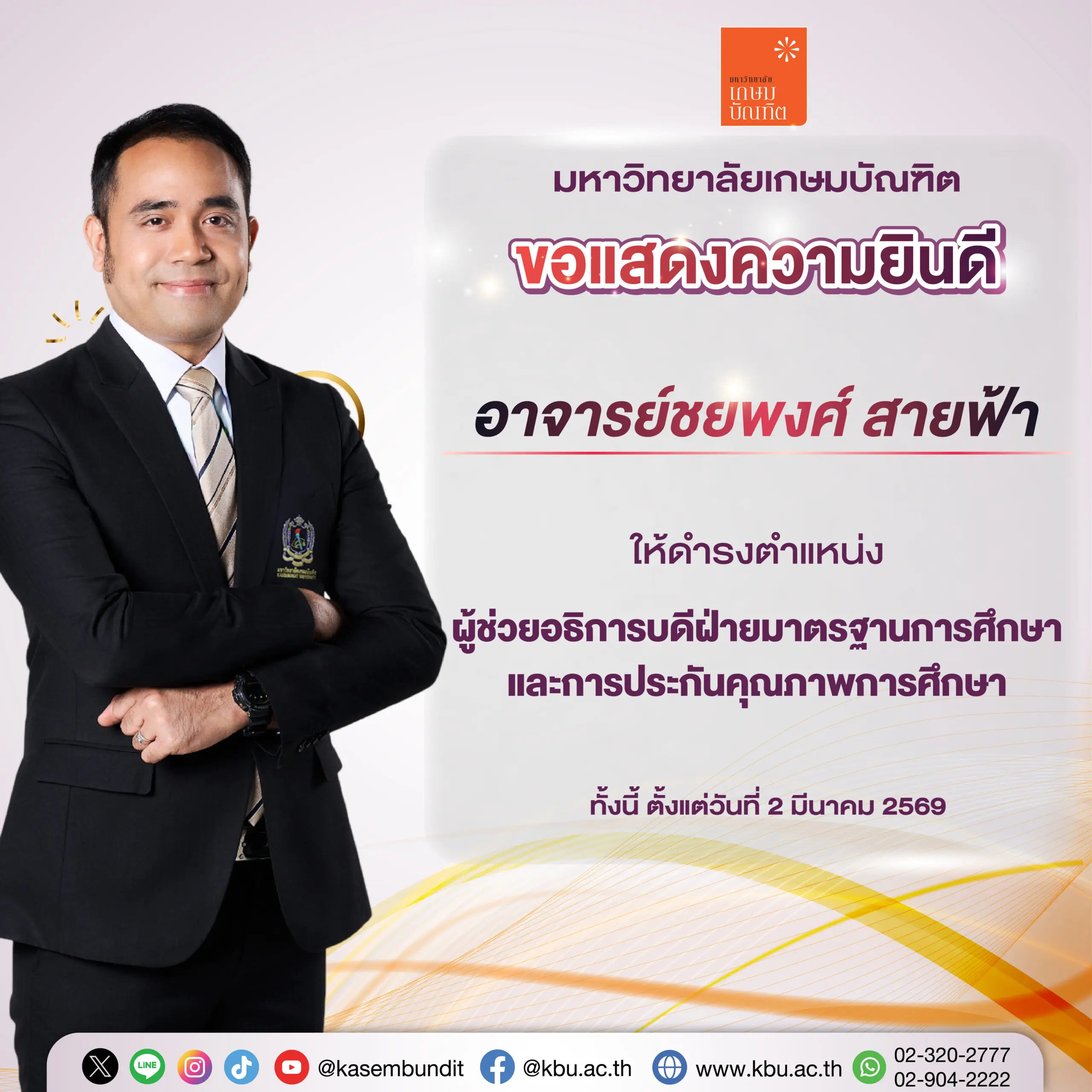 ขอแสดงความยินดี แด่ อาจารย์ชยพงศ์  สายฟ้า ในโอกาสที่มหาวิทยาลัย แต่งตั้งให้ ดำรงตำแหน่ง ผู้ช่วยอธิการบดีฝ่ายมาตรฐานการศึกษาและการประกันคุณภาพการศึกษา เพื่อเสริมศักยภาพการบริหารงานและยกระดับองค์กรให้ก้าวทันการเปลี่ยนแปลง และเป็นกำลังสำคัญในการพัฒนามหาวิทยาลัยสู่ความเป็นเลิศอย่างยั่งยืน