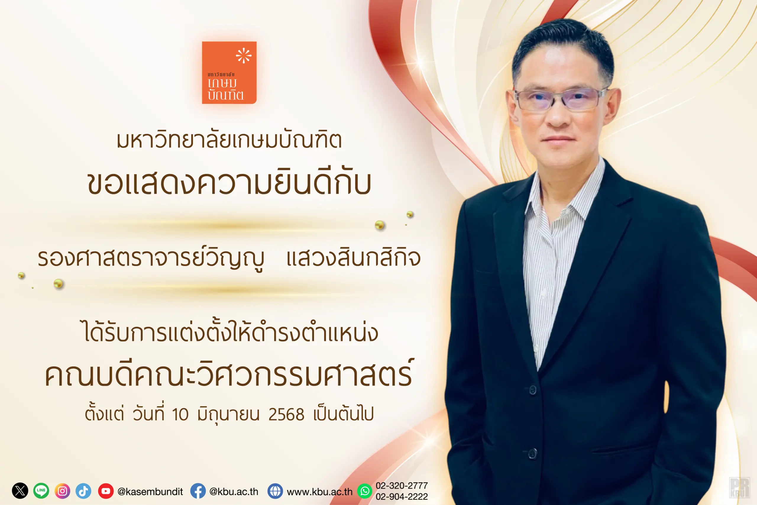 มหาวิทยาลัยเกษมบัณฑิต ขอแสดงความยินดีกับ รองศาสตราจารย์วิญญู แสวงสินกสิกิจ ได้รับการแต่งตั้งให้ดำรงตำแหน่ง คณบดีคณะวิศวกรรมศาสตร์