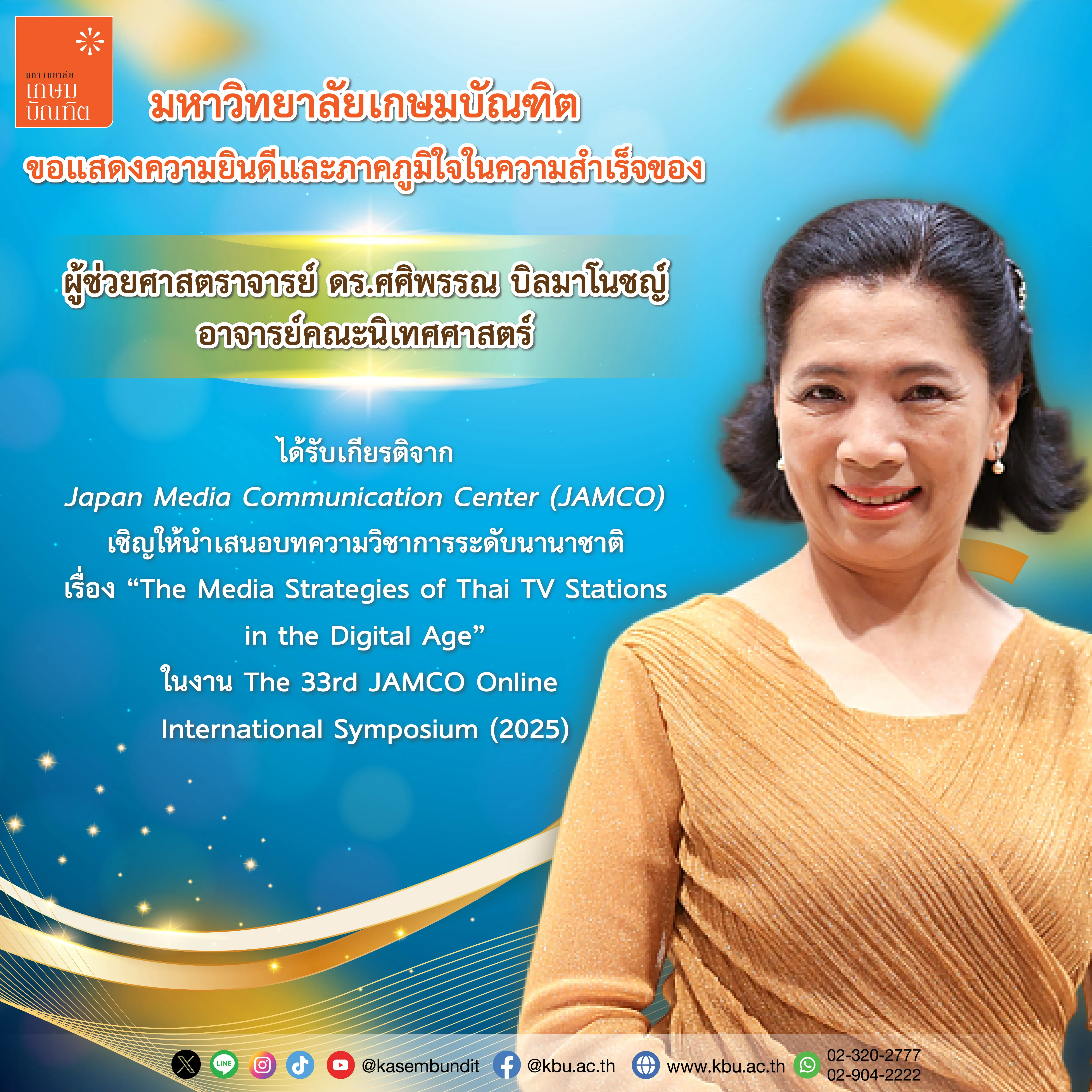 มหาวิทยาลัยเกษมบัณฑิต ขอร่วมแสดงความยินดีและภาคภูมิใจในความสำเร็จของ ผู้ช่วยศาสตราจารย์ ดร.ศศิพรรณ บิลมาโนชญ์ อาจารย์คณะนิเทศศาสตร์ ที่ได้รับเกียรติจาก Japan Media Communication Center (JAMCO) เชิญให้นำเสนอบทความวิชาการเรื่อง “The Media Strategies of Thai TV Stations in the Digital Age” ในการประชุมสัมมนาออนไลน์ระดับนานาชาติ “The 33rd JAMCO Online International Symposium (2025): Media Strategies of Southeast Asian Television Stations for the Digital Age”