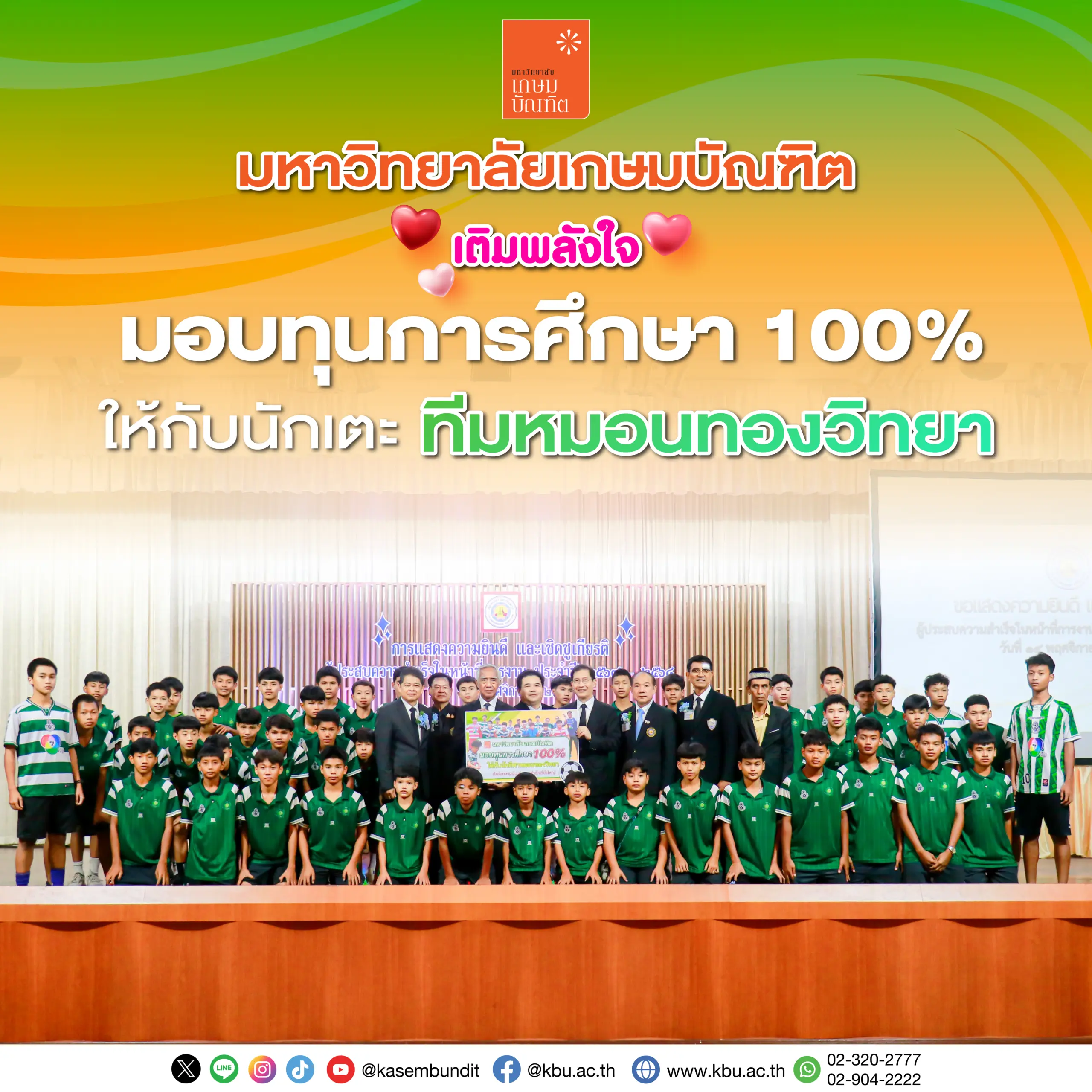 มหาวิทยาลัยเกษมบัณฑิต เดินหน้าสนับสนุนเยาวชนด้านกีฬาอย่างต่อเนื่อง ล่าสุดได้มอบ “ทุนการศึกษา 100%” ให้แก่นักเตะเยาวชนจาก ทีมหมอนทองวิทยา จากโรงเรียนหมอนทองวิทยา อ.บางน้ำเปรี้ยว จ.ฉะเชิงเทรา เพื่อเป็นการเปิดโอกาสให้เยาวชนไทยได้พัฒนาความสามารถทั้งด้านกีฬาและการเรียนไปพร้อมกัน ภายในพิธีมอบทุนได้รับเกียรติจากดร.วัลลภ สุวรรณดี อธิการบดีมหาวิทยาลัยเกษมบัณฑิต ดร.เสนีย์ สุวรรณดี รองอธิการบดีฝ่ายวางแผนและพัฒนา ในฐานะผู้ดูแลการจัดการด้านกีฬาของมหาวิทยาลัย พร้อมคณะผู้บริหาร ร่วมแสดงความยินดี พร้อมให้กำลังใจแก่เยาวชนผู้มุ่งมั่นสู่เส้นทางนักกีฬามืออาชีพ บรรยากาศเป็นไปอย่างอบอุ่นและเต็มไปด้วยพลังบวก เพื่อสนับสนุนทุนด้านกีฬาของมหาวิทยาลัยเกษมบัณฑิตมีเป้าหมายเพื่อผลักดันนักกีฬาไทยรุ่นใหม่ ให้มีโอกาสเติบโตทั้งด้านวิชาการและทักษะกีฬาอย่างยั่งยืน พร้อมเป็นกำลังสำคัญของวงการกีฬาในอนาคต มหาวิทยาลัยเกษมบัณฑิตยังคงมุ่งมั่นพัฒนาศักยภาพเยาวชนไทย ผ่าน “ทุนกีฬา – ทุนความสามารถพิเศษ” หลายประเภท เพื่อให้การศึกษาเป็นพื้นที่เปิดกว้างสำหรับทุกความฝันของนักเรียนและนักกีฬาไทยทุกคน