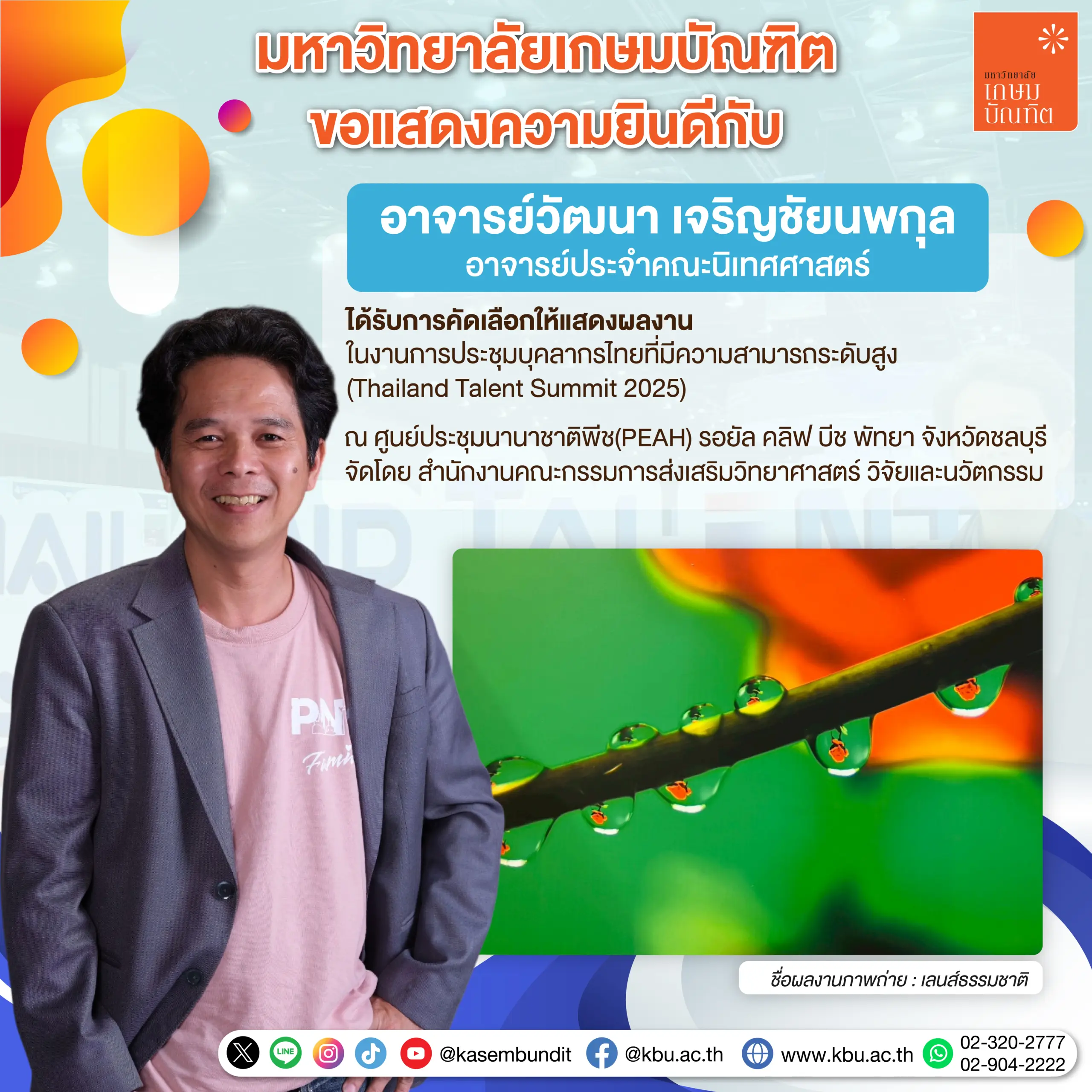 มหาวิทยาลัยเกษมบัณฑิต ขอแสดงความยินดีกับ อาจารย์วัฒนา เจริญชัยนพกุล อาจารย์ประจำคณะนิเทศศาสตร์ ที่ได้รับการคัดเลือกให้นำเสนอผลงานสร้างสรรค์ ในงานประชุมบุคลากรไทยที่มีความสามารถระดับสูง Thailand Talent Summit 2025 ณ ศูนย์ประชุมนานาชาติพีช (PEACH) โรงแรมรอยัล คลิฟ บีช พัทยา จังหวัดชลบุรี โดยสำนักงานคณะกรรมการส่งเสริมวิทยาศาสตร์ วิจัยและนวัตกรรม  โดยผลงานนี้ได้รับการคัดเลือก จากผลงานภาพถ่ายแนวสร้างสรรค์ ภายใต้ชื่อ เลนส์ธรรมชาติ” ซึ่งสะท้อนมุมมองเชิงศิลปะ ความคิดสร้างสรรค์ และการประยุกต์ใช้ทักษะด้านนิเทศศาสตร์ได้อย่างโดดเด่น ซึ่งจะเป็นแบบอย่างการการสร้างแรงบันดาลใจให้แก่นักศึกษาในการเรียนและการพัฒนาศักยภาพและสร้างสรรค์ผลงานสู่เวทีระดับประเทศต่อไป
