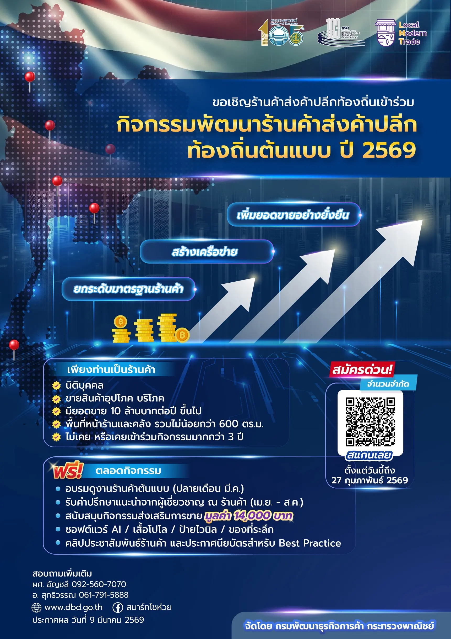 สถาบันนวัตกรรมและธุรกิจการค้าเสรี มหาวิทยาลัยเกษมบัณฑิต ขอเชิญชวนร้านค้าส่งค้าปลีกท้องถิ่นทั่วประเทศ สมัครเข้าร่วมกิจกรรมพัฒนาร้านค้าส่งค้าปลีกท้องถิ่นต้นแบบ ประจำปี 2569 เพื่อยกระดับมาตรฐานร้านค้า สร้างเครือข่าย และเพิ่มยอดขายอย่างยั่งยืน