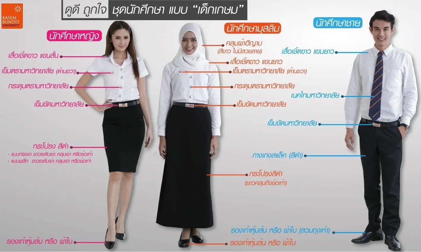 คาดเข็มขัด กลัดกระดุม และติดเข็มตรามหาวิทยาลัยรองเท้าคัทชูสีดำ